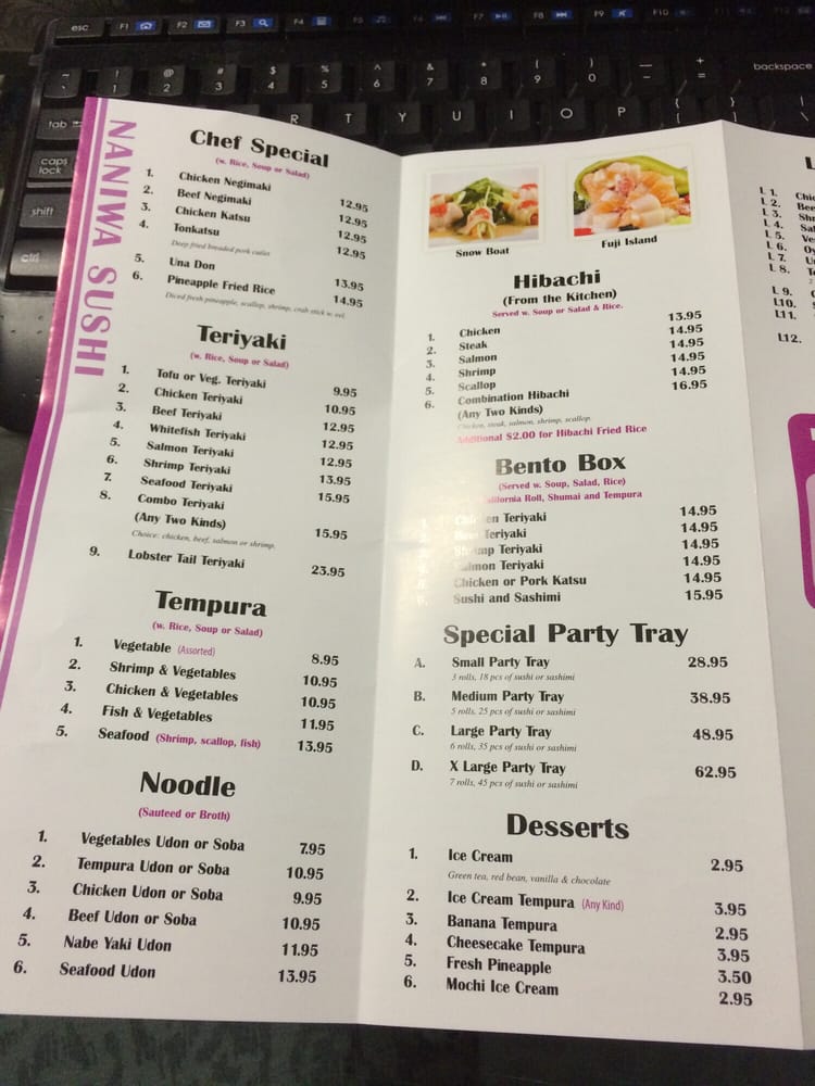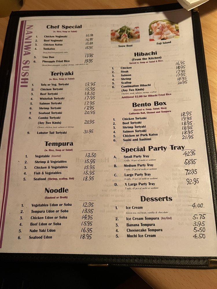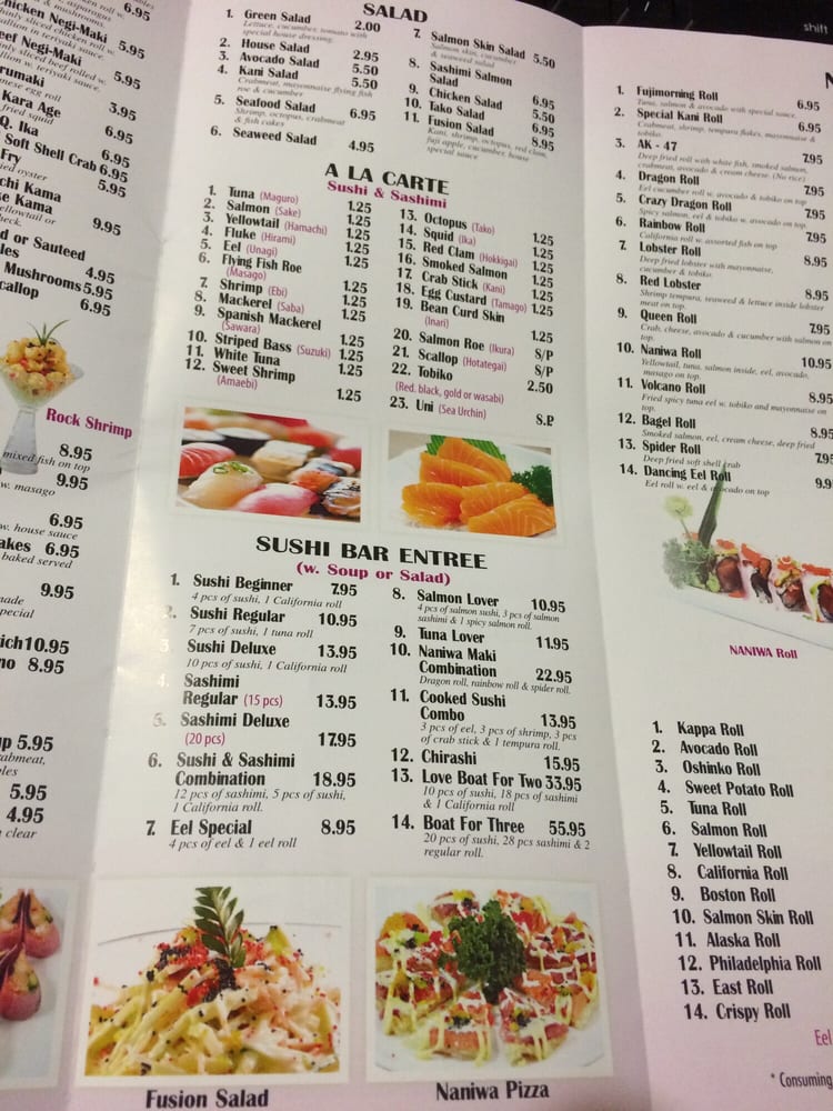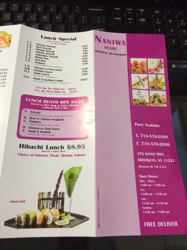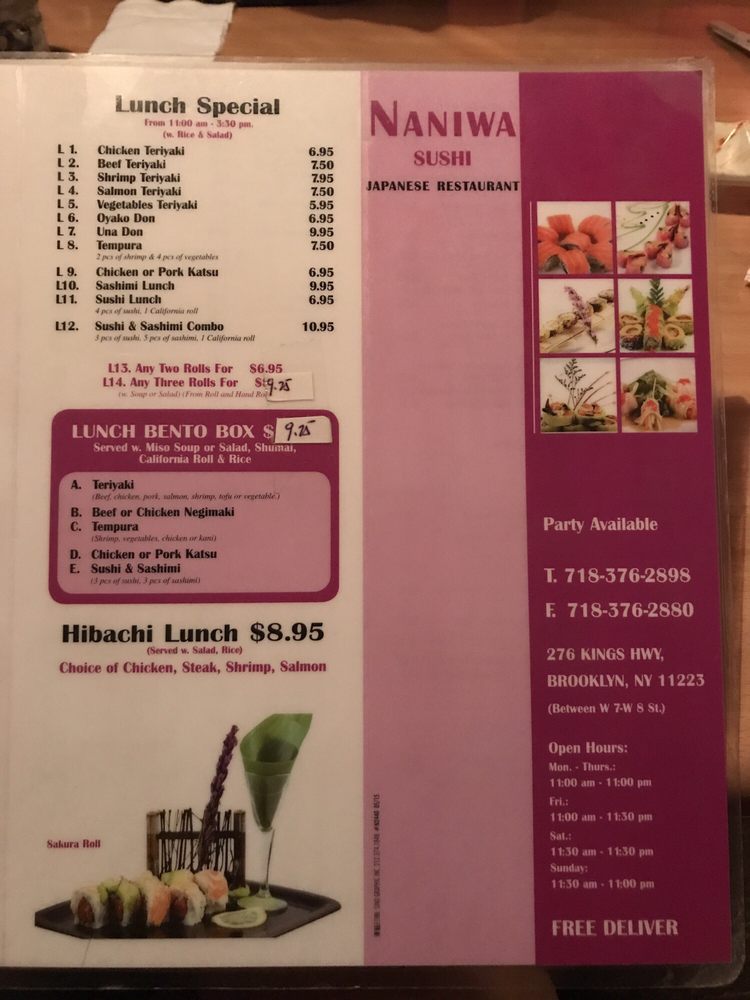 Introducing the menu at Naniwa Sushi, a hidden gem in Brooklyn, specializing in fresh and tasty Japanese cuisine. Located conveniently near the N train station, this family-owned restaurant offers a wide variety of sushi, sashimi, and other Japanese dishes. Customers rave about the quality and taste of the food, with favorites like the Sex on The Beach roll and the kani salad. The ambiance is casual yet classy, perfect for a quiet meal with friends or family. With options for delivery, takeout, and catering, Naniwa Sushi caters to all dining preferences. The friendly staff, quick service, and affordable prices make it a go-to spot for sushi lovers in the neighborhood. Whether you're a sushi aficionado or looking to try something new, Naniwa Sushi is sure to impress with their delicious offerings.